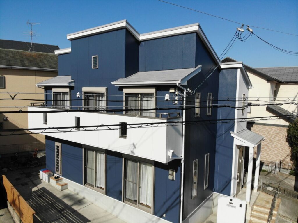 外壁全体はダークネイビーに、バルコニー部分はホワイトを採用。
