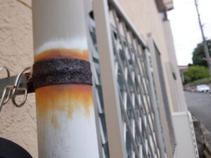 また、付帯部分の鉄部にも錆の発生が確認されました。鉄部は雨や湿気の影響を受けやすく、