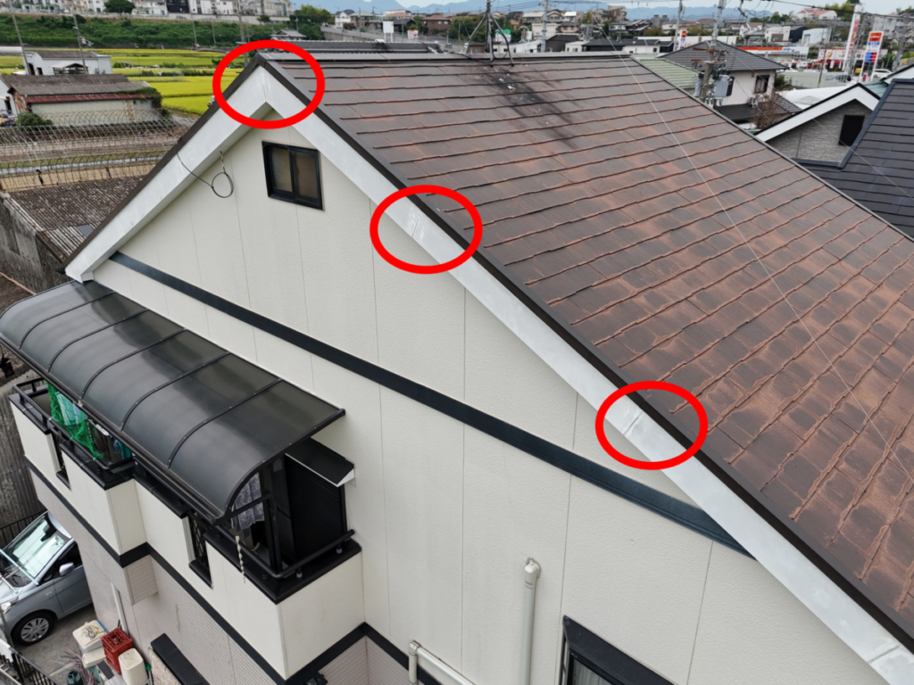 写真の赤丸部分のように、破風板と外壁、屋根との取り合い部分に隙間が生じており、