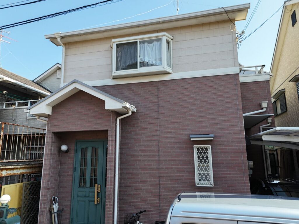 外壁は、ベージュとレンガ調のツートンカラーから