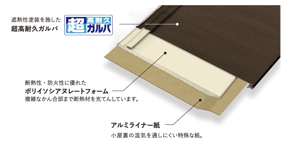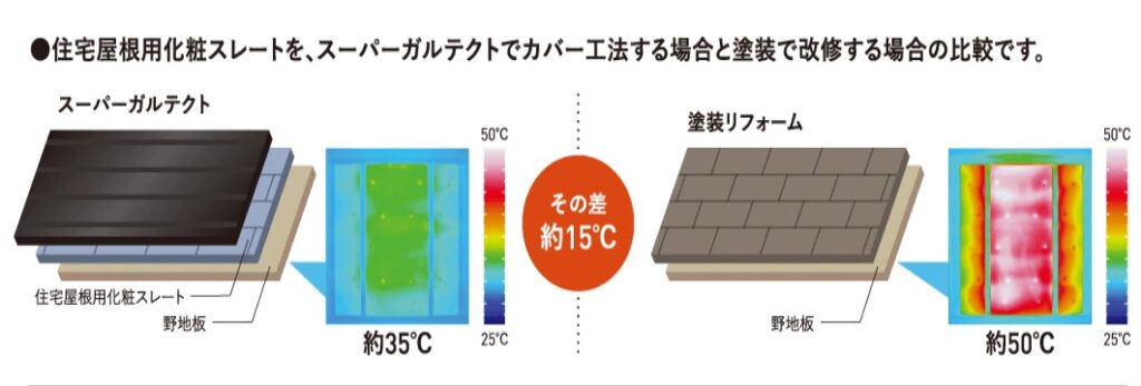目次 屋根のリフォームを検討する際、 「塗装で済ませるか」「葺き替えやカバー工法にするか」で悩まれる方は非常に多いです。 初期費用だけを見れば塗装は魅力的ですが、長期的な視点で考えると、 必ずしも最適とは限りません。 屋根は普段あまり目にする機会が少ないため、ついコスト重視で判断してしまいがちですが、 住まい全体を守る重要な役割を担っています。 そのため、目先の費用だけでなく、 将来的なメンテナンスや耐久性まで含めて検討することが大切です。 そこで近年、多くの現場で採用されているのが「スーパーガルテクト」です。 スーパーガルテクトとは、軽量で耐久性の高いガルバリウム鋼板に 断熱材を一体化させた屋根材で、従来の金属屋根に比べて断熱性・遮熱性に優れています。 さらに表面には高耐久塗膜が施されており、美観と性能を長期間維持できる点も大きな魅力です。 また、非常に軽量なため建物への負担が少なく、耐震性の向上にもつながります。 既存の屋根の上から施工するカバー工法にも適しており、 解体費や廃材処理費を抑えられる点もメリットです。 加えて、錆びにくく耐候性に優れているため、頻繁なメンテナンスが不要となり、 長期的な安心につながります。 一方で、「まだ塗装できる状態だから」と塗装を選ばれるケースも少なくありません。 確かに塗装は初期費用を抑えられるメリットがありますが、 あくまで表面の保護にとどまり、屋根材そのものの劣化までは改善できません。 一般的には10年〜15年ごとに再塗装が必要となり、その都度費用と手間がかかります。 さらに、ひび割れや反り、下地の傷みが進行している場合には、 塗装では根本的な解決にならず、短期間で再び不具合が発生する可能性もあります。 その結果、長い目で見るとコストがかさみ、かえって負担が大きくなることもあります。 その点、スーパーガルテクトによるカバー工法や葺き替えは、 屋根全体を新しくするため、劣化の原因を根本から解消できます。 断熱材一体型の構造により、夏の暑さや冬の寒さを和らげ、 室内環境の改善や光熱費削減にも貢献します。 初期費用は塗装より高くなる傾向がありますが、 メンテナンス回数の少なさや耐久性を考慮すると、 トータルコストでは非常に優れた選択と言えるでしょう。 屋根は住まいを守る最も重要な部分の一つです。 だからこそ、短期的な安さではなく、 長期的な安心と快適性を見据えたリフォームを検討することが重要です。屋根リフォームで注目の「スーパーガルテクト」とは?